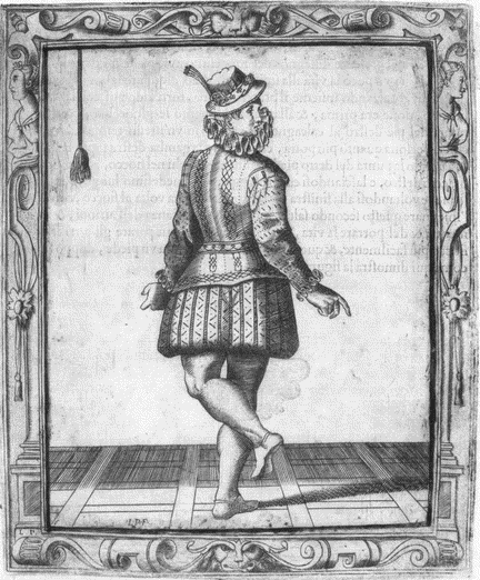 The back-trick or ruade, another galliard step, involved kicking one leg backwards at the knee sometimes while jumping. Although the dance step bears no lewd implications, the English name Shakespeare uses for it, ‘the back-trick’ could also refer to an underhanded deed or a sexual act-as in a prostitute’s turning tricks-involving the backside or posterior.