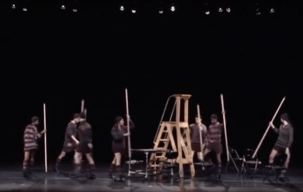 Setterfield, as Gordon’s Chorus, highlights those problems from her very first entrance; she climbs the A-frame ladder to address the audience in a wry, matter-of-fact tone, openly admitting that what they are about to see will not look anything like Shakespeare’s Henry V, particularly since it will only consist of one act running about an hour. Further, the limited personnel involved necessitates a drastic reduction in the story: Setterfield tells the audience that they had to cut “all the lords of the English court, and all the lords of the French court. We are, after all, only seven dancers, three dummies, and me.”