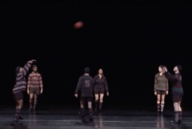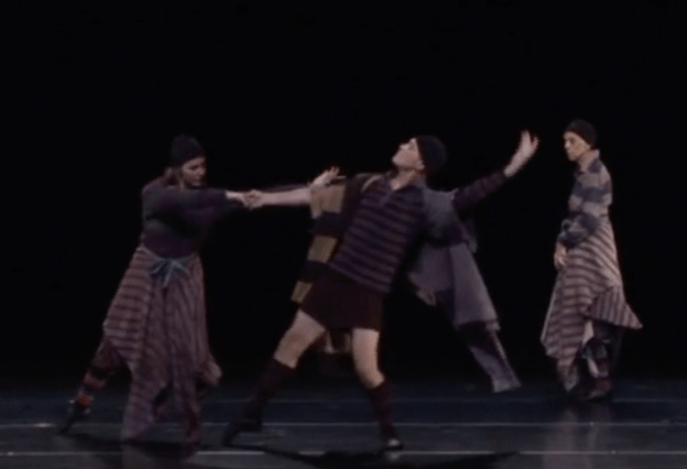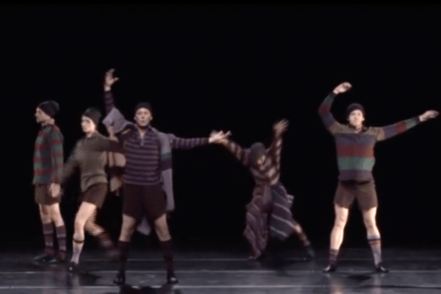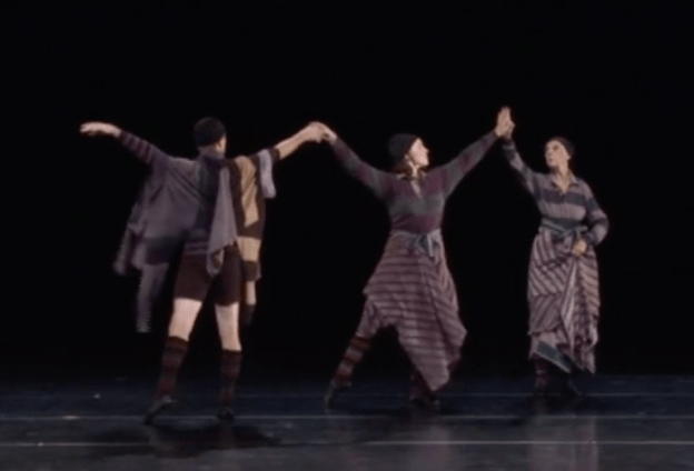 The most striking example of meta-theatricality in Dancing Henry Five occurs in the middle of the piece, between Katherine’s English lesson and the Battle of Agincourt, when the Chorus intervenes to let the audience know which parts of Shakespeare’s play have been cut. Setterfield tells the audience, quite nonchalantly, that “we’ve omitted the battle of Harfleur … and we’ve cut the three traitors that Henry condemned, and all of Henry’s old roustabout friends, who after Falstaff’s death join the army.” She indicates that this is due to lack of personnel, but also because they will focus most of their energy on Agincourt, “which is musically much longer.” Walton’s score provides more music for Agincourt than for any of the other scenes that were cut, and will provide a more extended opportunity for choreography than other scenes in Shakespeare’s play or Olivier’s film adaptation.