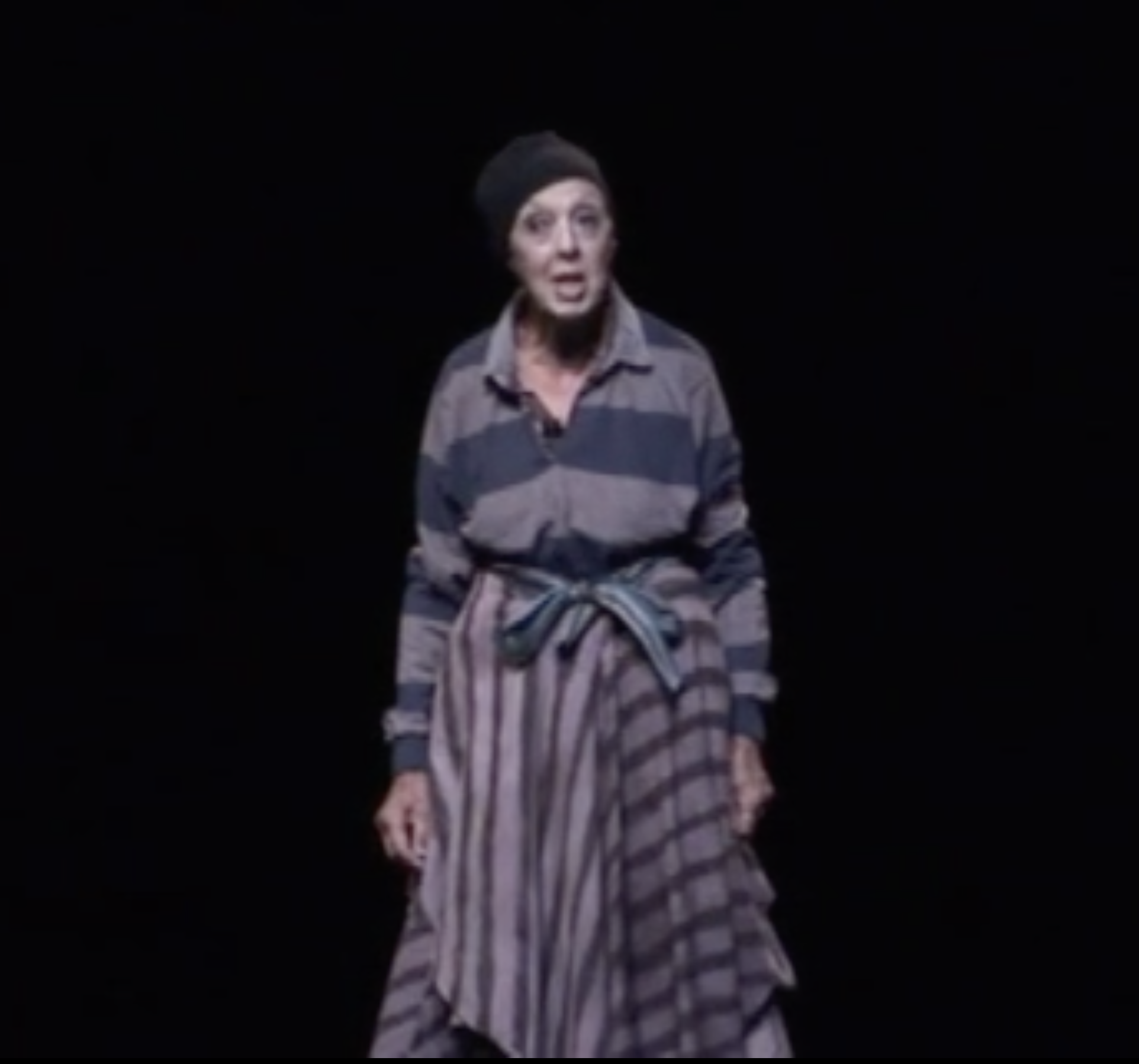 Just as Gordon’s staging of the St. Crispian’s Day speech and the Battle of Agincourt distance the audience from the impact of these events, Setterfield’s embodiment of Falstaff earlier in the piece likewise undercuts the possibilities for emotional engagement. As in Shakespeare’s play, Gordon references the death of Falstaff and provides some background from 2 Henry IV to contextualize the character for the audience. Once the former Prince Hal has been “newly crowned King Henry Five,” Setterfield becomes “old, fat, dying Falstaff” by taking off her cap to reveal her white hair, clutching a pillow to her abdomen, and lying down on a gurney. Her manner throughout emphasizes performativity, as there is no attempt to realistically transform her into the old male knight. Further, once the recorded dialogue of Falstaff and Henry from the end of 2 Henry IV has finished playing, she sits up quickly, deliberately breaking the mood, and throwing off her role along with the blanket that covered her. “Okay. Falstaff is dead,” she announces abruptly and unsentimentally, provoking some slight audience laughter at the juxtaposition of the serious scene with the evident need to move the action along expeditiously.