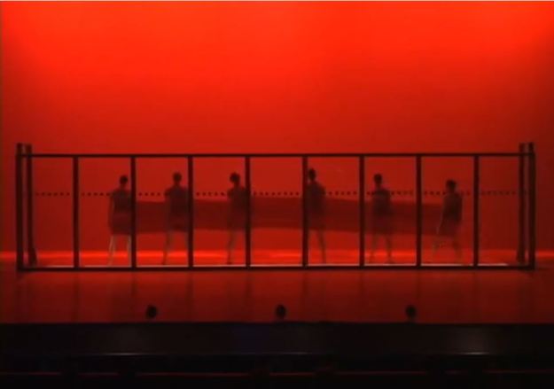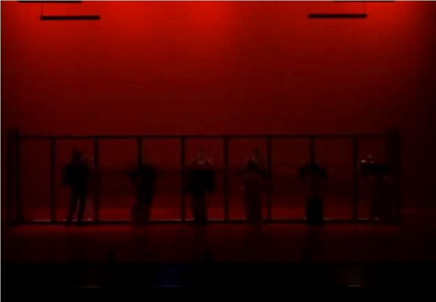 The first clip reveals a string of six Lavinias behind the security partition, bound together by a swath of red cloth (0:0:10, see Fig. 1). Initially, Walsh’s choreography depicts Lavinia’s physical inadequacy; the dancers wriggle their shoulders with hands behind their backs to convey labored movement. Wobbly legs and bowed heads are a hallmark of this sequence, as the dancers struggle with their limited abilities (0:2:40, see Fig. 2). Soon, however, the choreography becomes more encompassing as the dancers maneuver a greater number of body parts, experimenting with the boundaries of their new range of motion (0:3:19 – 0:4:04, see Video 1).